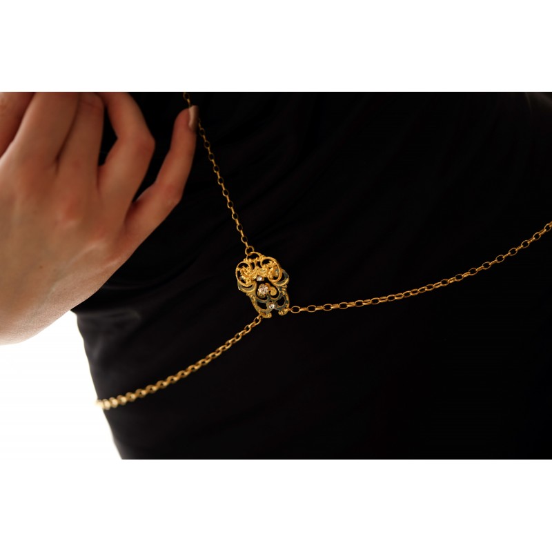 Brass filigree Body Jewel with gold plating and high quality crystals applications.