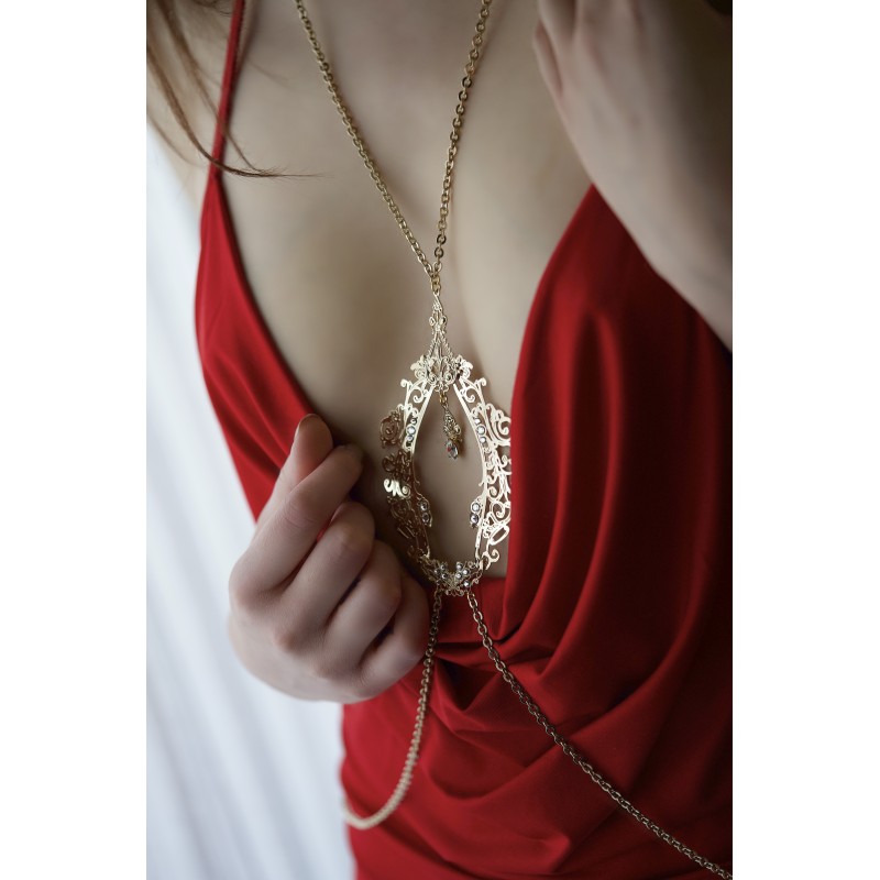 Brass filigree Body Jewel with gold plating and high quality crystals applications.