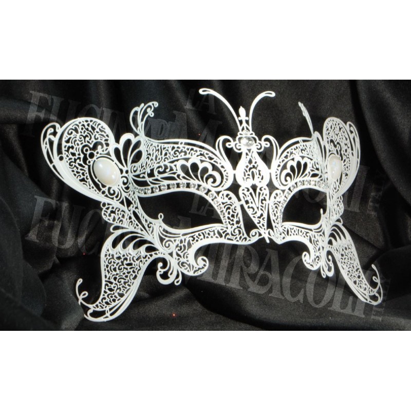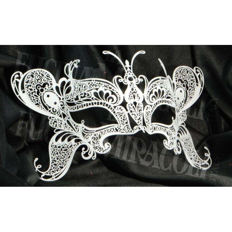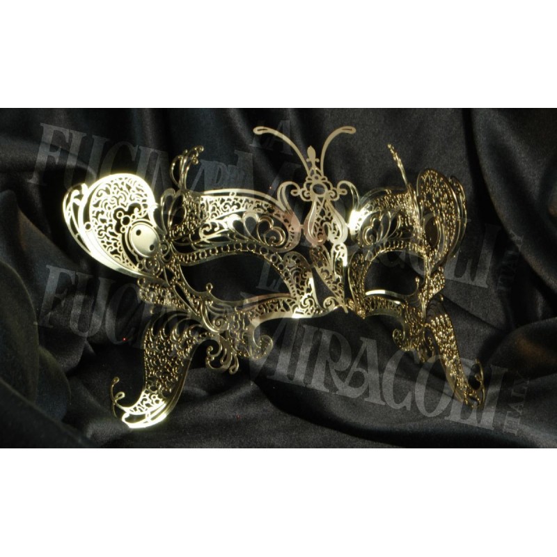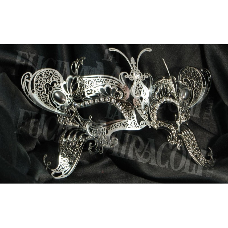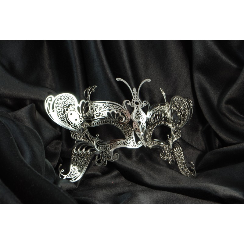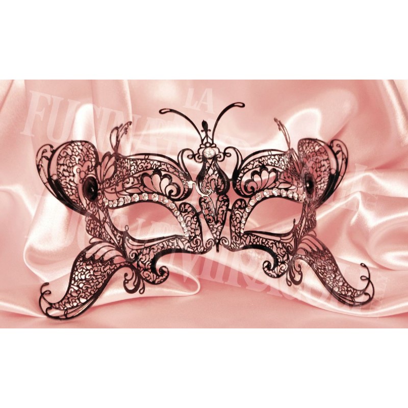 Hand-crafted black metal filigree mask. Metal filigree masks are our innovation: they were first designed in 2008. Farfalla is an original design, made entirely in Italy by la Fucina dei Miracoli craftspeople.