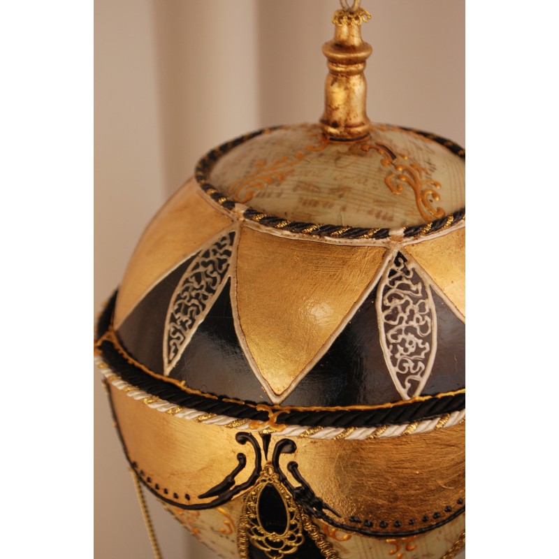 Decorated with gold leaf, trimmings, metallic filigree and gold plated chains. Equipped with a ring for hanging.