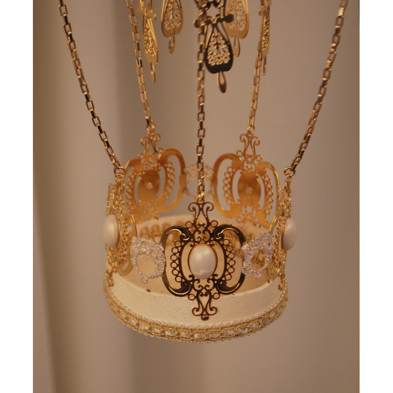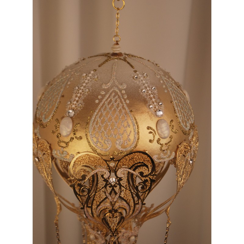 Decorated with gold leaf, trimmings, metallic filigree and gold plated chains. Equipped with a ring for hanging.