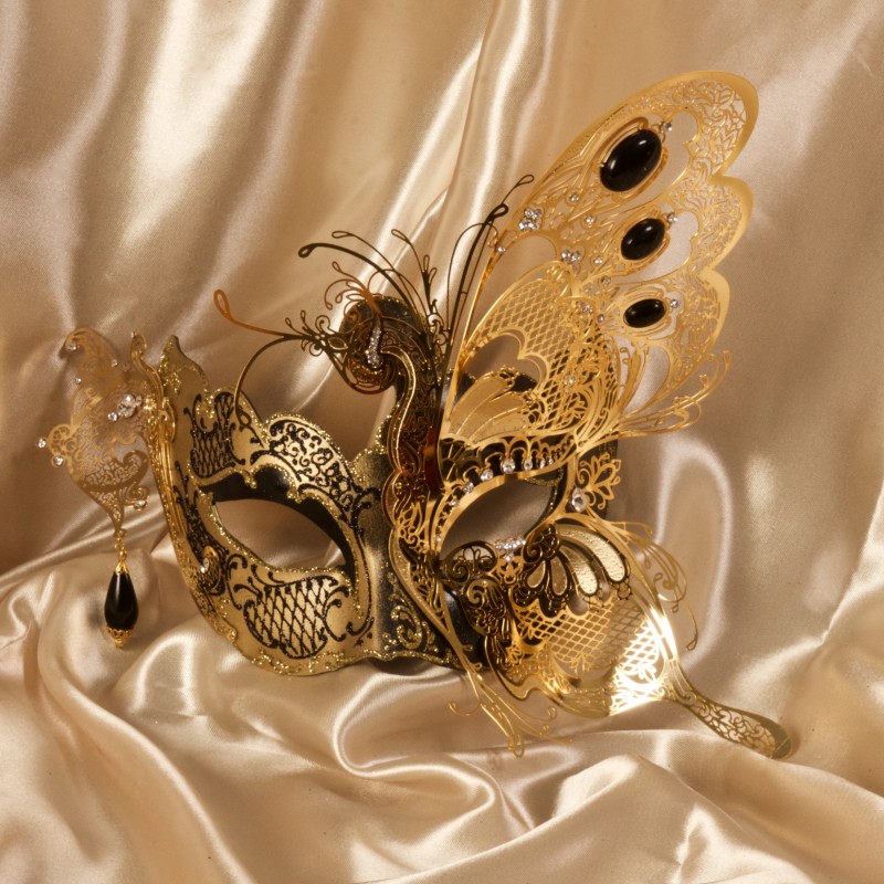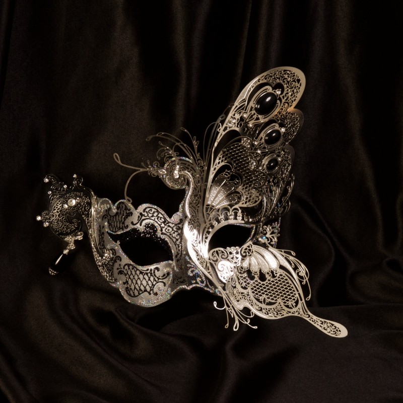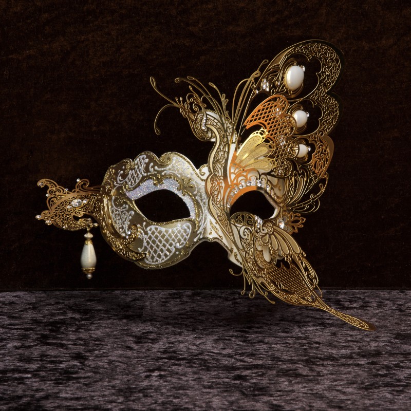 Decorata con passamanerie, perle, metalli traforati e cristalli di altissima qualità, per una serata scintillante. La maschera nella sua essenza: un oggetto fatto per celare, ma anche per mostrare.