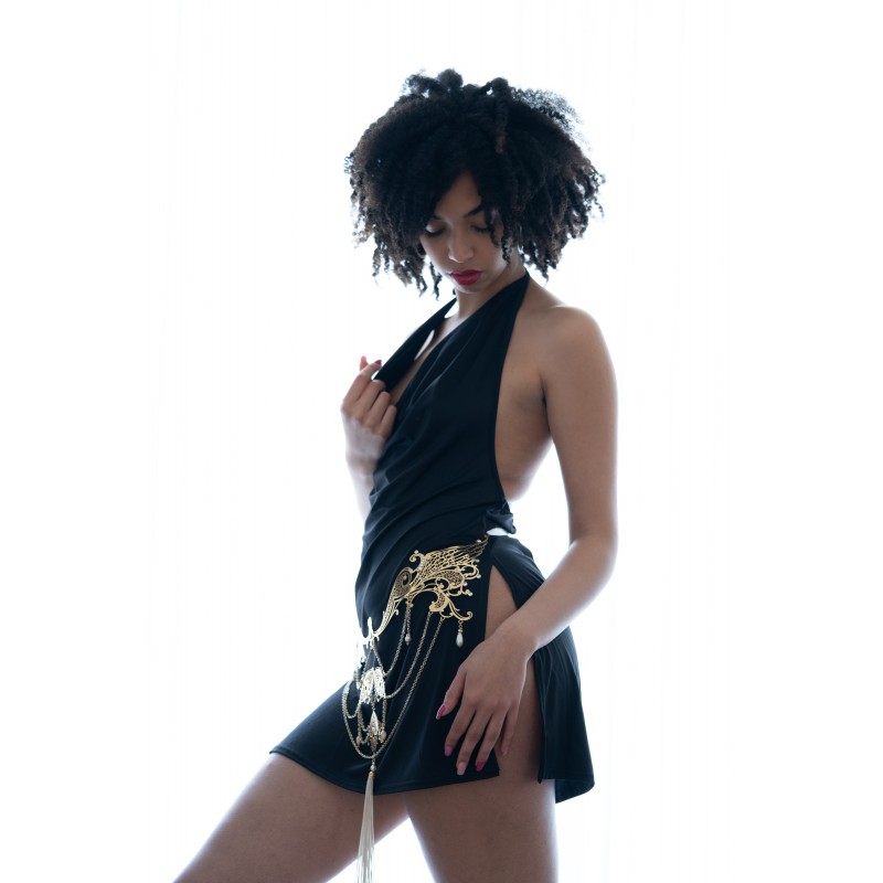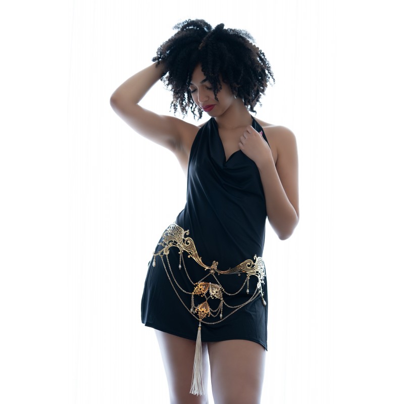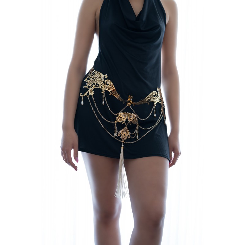 Gioiello per il corpo in filigrana metallica e catenelle con bagno oro e applicazioni di cristalli di altissima qualità.