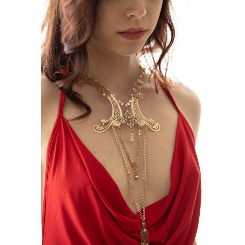 Brass filigree Body Jewel with gold plating and high quality crystals applications.
