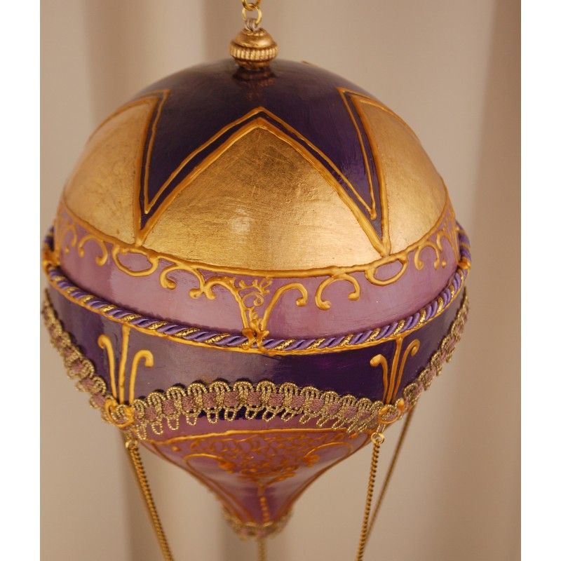 Mongolfiera in cartapesta realizzata interamente a mano. Decorata e arricchita di foglia d'oro, passamanerie, filigrane metalliche e catenelle in galvanica dorata.