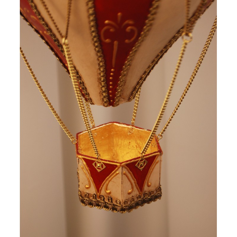 Mongolfiera in cartapesta realizzata interamente a mano. Decorata e arricchita di foglia d'oro, passamanerie, filigrane metalliche e catenelle in galvanica dorata.