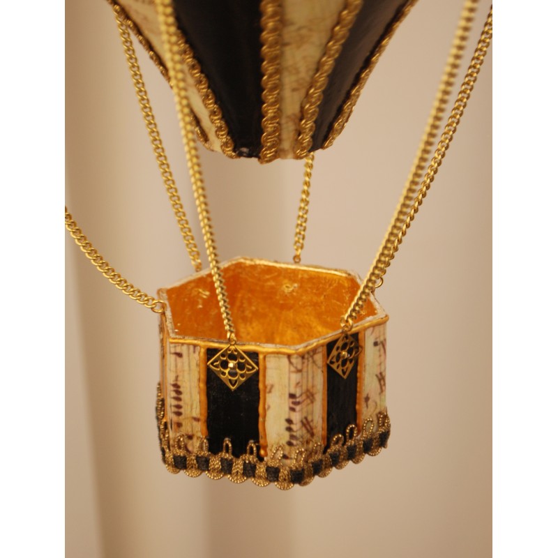 Mongolfiera in cartapesta realizzata interamente a mano. Decorata e arricchita di foglia d'oro, passamanerie, filigrane metalliche e catenelle in galvanica dorata.