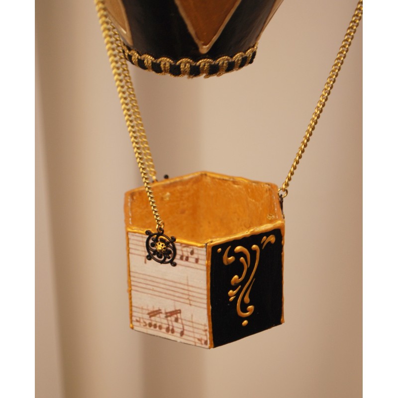 Mongolfiera in cartapesta realizzata interamente a mano. Decorata e arricchita di foglia d'oro, passamanerie, filigrane metalliche e catenelle in galvanica dorata.