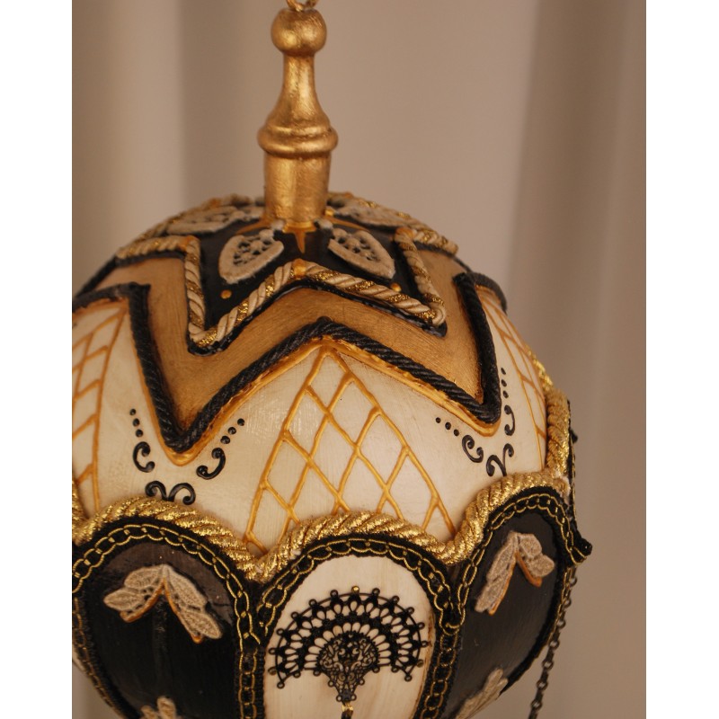 Mongolfiera in cartapesta realizzata interamente a mano. Decorata e arricchita di foglia d'oro, passamanerie, filigrane metalliche e catenelle in galvanica dorata.